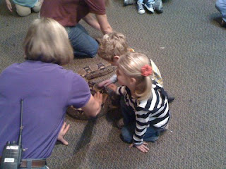 I was shocked by Allie's reaction to the snake. When they told us to move to the other room because we were going to be meeting a large snake, Allie was the first one up from the table. She RAN into the other room where the snake was and YES she went right over to pet the snake. I was not expecting this reaction from my little girl, but glad she enjoyed her experience. I on the other hand had to hide my reaction for "fear of snakes" and pretend that I was really excited sitting on the floor with this large Boa slithering next to me